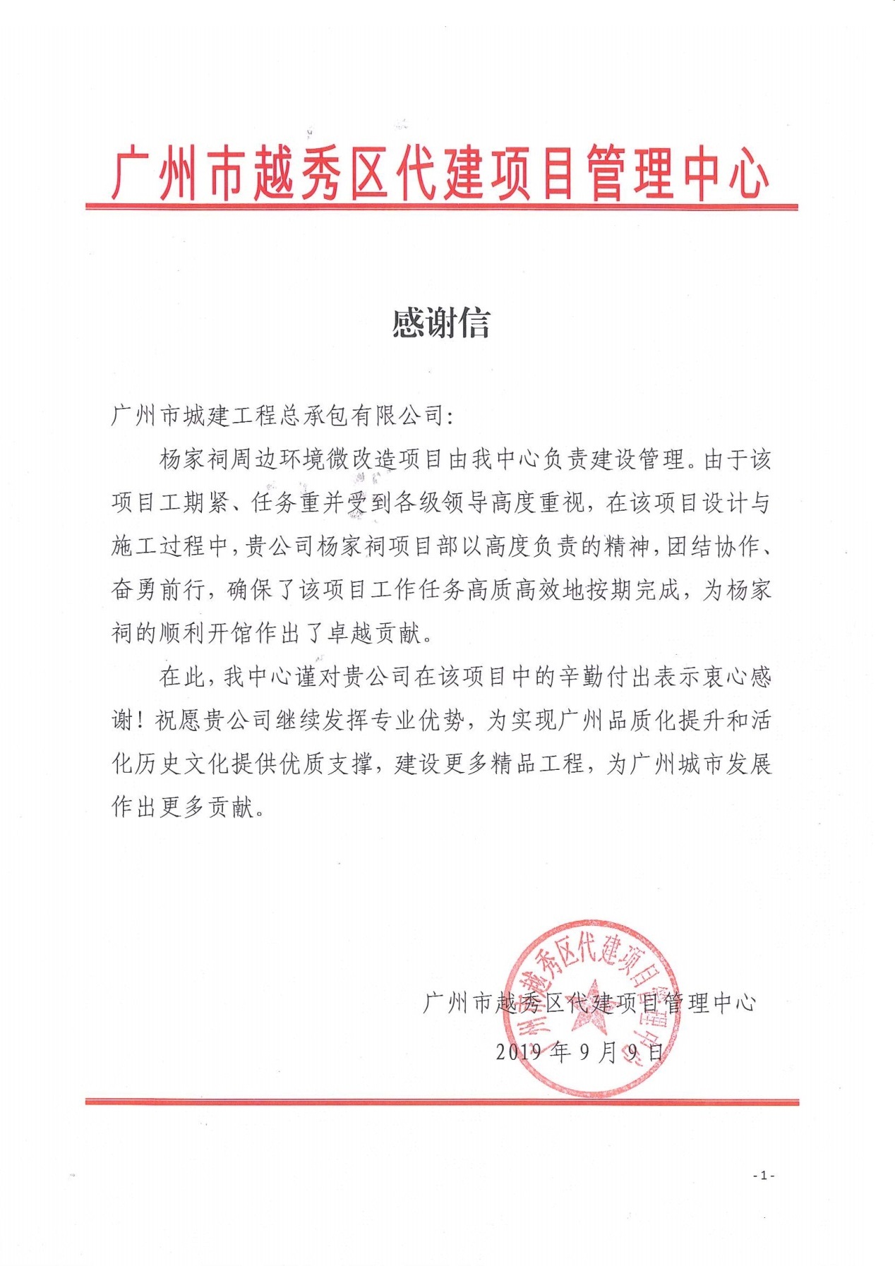 近期,楊家祠周邊環(huán)境微改造項(xiàng)目的建設(shè)單位——廣州市越秀區(qū)代建項(xiàng)目管理中心發(fā)來(lái)了感謝信,項(xiàng)目屬地居委——北京街道廣衛(wèi)社區(qū)居委會(huì)也送來(lái)了錦旗,表達(dá)了對(duì)楊家祠項(xiàng)目部工作的充分肯定和感謝。