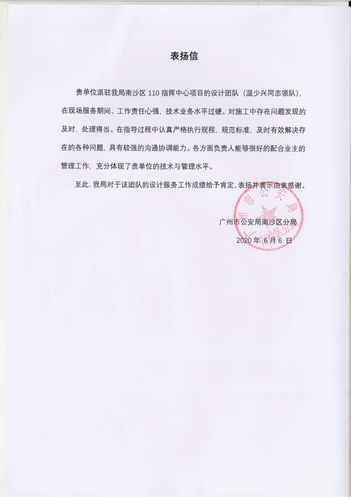 近日,廣州市公安局南沙區(qū)分局送來表揚信,對我公司廣州市南沙公安分局110指揮中心裝修設計工程的設計團隊給予表揚。