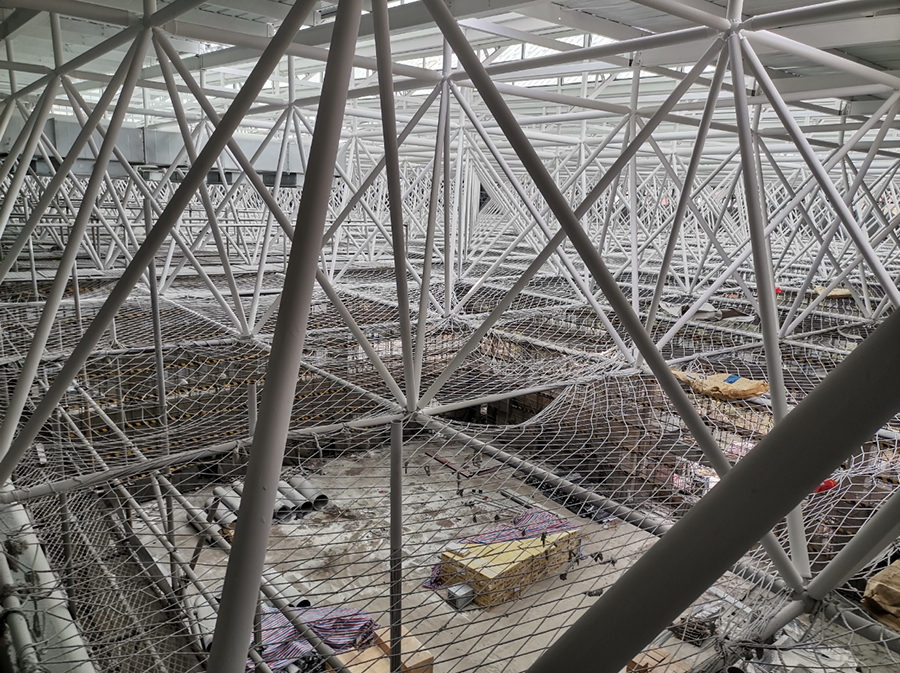 現(xiàn)場施工人員從工程特點(diǎn)、施工程序、施工工藝、施工技術(shù)等方面作了詳細(xì)講解,雙方就關(guān)鍵技術(shù)點(diǎn)進(jìn)行了全方位技術(shù)交流。該網(wǎng)架結(jié)構(gòu)采用網(wǎng)架桿件、螺栓球等網(wǎng)架材料,整體網(wǎng)架尺寸為39x42米,重量約69.5噸,吊裝提升高度約14.9米。根據(jù)該網(wǎng)架的特點(diǎn),選用高空散裝方法安裝,將網(wǎng)架分為幾個(gè)單元,首先在地面進(jìn)行每塊區(qū)域單元網(wǎng)架的拼裝,然后進(jìn)行單元網(wǎng)架整體吊裝,最后在空中拼裝成一個(gè)大整體。個(gè)別單元網(wǎng)架由于局部角點(diǎn)問題,如安裝死角、吊臂位置受限等特殊因素導(dǎo)致吊車無法發(fā)揮正常使用功能,將網(wǎng)架材料運(yùn)送至事先安裝好的一個(gè)6X6米、高12米的鋼架平臺(tái)上,在平臺(tái)上拼裝成一球四桿的小單元網(wǎng)架后,然后人工搬運(yùn)小單元網(wǎng)架到安裝位置進(jìn)行整體拼裝。為防范安全風(fēng)險(xiǎn),在散裝的拼接過程中,散裝區(qū)域下方確保有一個(gè)鋪滿安全網(wǎng)的腳手架平臺(tái),做好高空作業(yè)人員防護(hù)措施,避免拼裝過程的安全隱患。