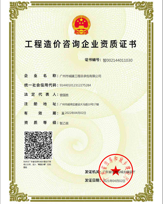 經(jīng)過公司積極籌備,不斷完善材料,公司工程造價咨詢暫乙級資質(zhì)申請順利通過廣州市住房和城鄉(xiāng)建設(shè)局審批,并于2021年4月2日取得資質(zhì)證書。此次暫乙級資質(zhì)的獲得,為公司進(jìn)一步開拓工程造價咨詢市場奠定了基礎(chǔ),使公司的業(yè)務(wù)范圍得到延伸。公司將更加努力拓寬業(yè)務(wù)渠道,不斷提高工程管理服務(wù)水平,同時為局和院的概預(yù)算工作提供更全面、更專業(yè)的服務(wù)和保障。