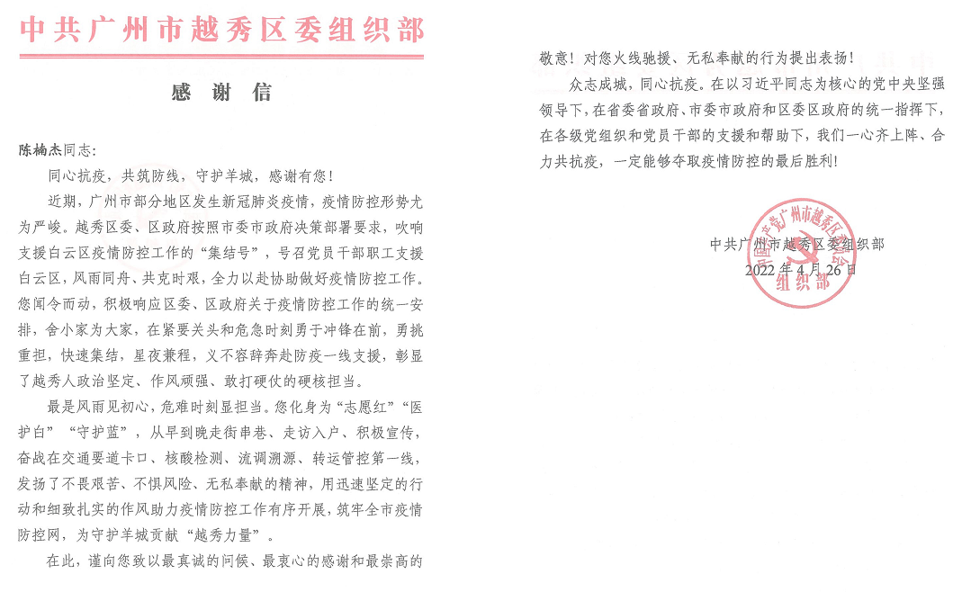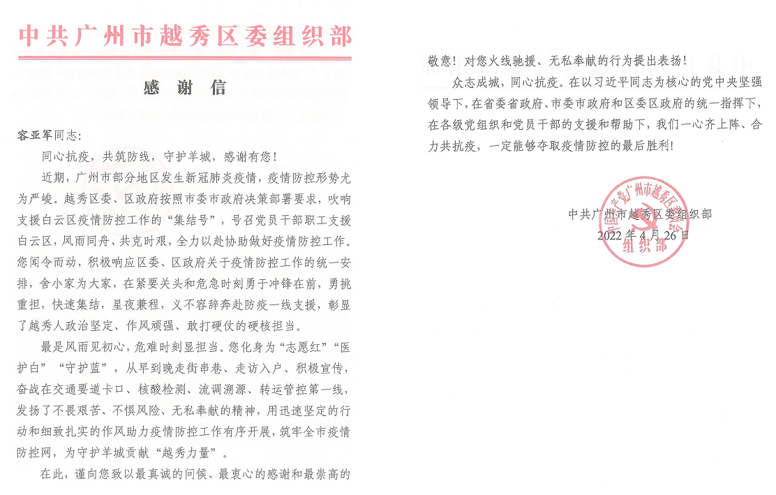 中共廣州市越秀區(qū)委組織部對公司支援白云區(qū)大朗村疫情防控工作的志愿服務人員容亞軍和陳楠杰同志,在緊要關頭沖鋒在前、快速集結(jié)、義不容辭的出色表現(xiàn)發(fā)來了感謝信。