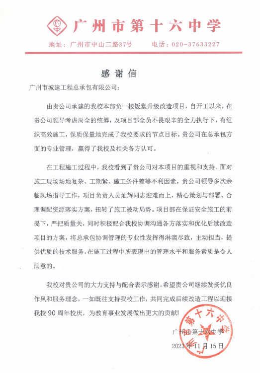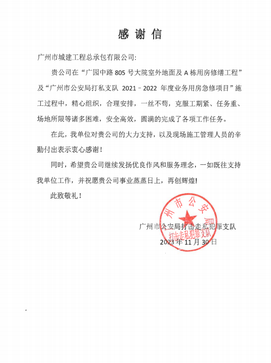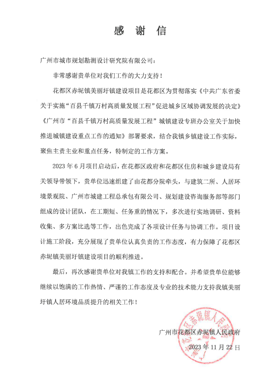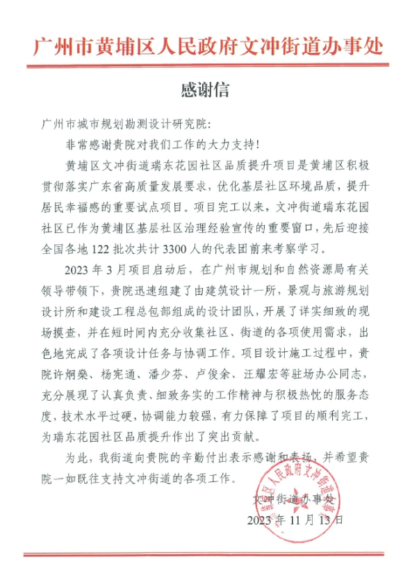 近期,公司陸續(xù)收到多個(gè)項(xiàng)目業(yè)主和配合單位發(fā)來的感謝信,黃埔區(qū)文沖街道辦-瑞東花園社區(qū)品質(zhì)提升項(xiàng)目、十六中學(xué)-校本部飯?zhí)酶脑祉?xiàng)目、花都赤坭鎮(zhèn)政府-美麗圩鎮(zhèn)全過程咨詢項(xiàng)目、廣州市公安局打私隊(duì)-廣園中路805號大院室外地面及A棟用房修繕工程、廣州市公安局打私支隊(duì)2021-2022年度業(yè)務(wù)用房急修項(xiàng)目、四川蜀西地勘集團(tuán)-肇慶歷史遺留礦山生態(tài)修復(fù)工程等參建單位對公司和項(xiàng)目參與成員所付出的工作表示肯定和感謝。對公司的項(xiàng)目團(tuán)隊(duì)發(fā)揮不怕疲勞、持續(xù)作戰(zhàn)的職業(yè)精神,在高強(qiáng)度駐場工作中表現(xiàn)出的高度工作熱情、強(qiáng)烈工作責(zé)任心、扎實(shí)專業(yè)素養(yǎng)和嚴(yán)謹(jǐn)細(xì)致的工作態(tài)度給予贊揚(yáng)。