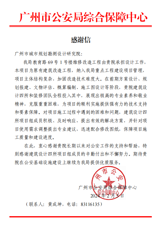 近日,廣州市公安局綜合保障中心發(fā)來感謝信,衷心感謝規(guī)劃院和我公司對教育路 69 號 1 號樓維修改造工程設計工作的支持,對我公司裝修設計團隊在室內(nèi)方案設計及施工圖設計階段展現(xiàn)出的專業(yè)能力和敬業(yè)精神,保障了項目...