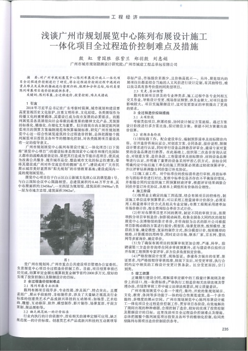 公司對(duì)廣州市規(guī)劃展覽中心陳列布展設(shè)計(jì)施工一體化項(xiàng)目全過(guò)程造價(jià)控制進(jìn)行了研究,將全過(guò)程造價(jià)控制過(guò)程中遇到的重點(diǎn)難點(diǎn)及采取的措施進(jìn)行整理歸納、梳理和分析總結(jié),給同類型陳列布展項(xiàng)目造價(jià)控制提供參考。